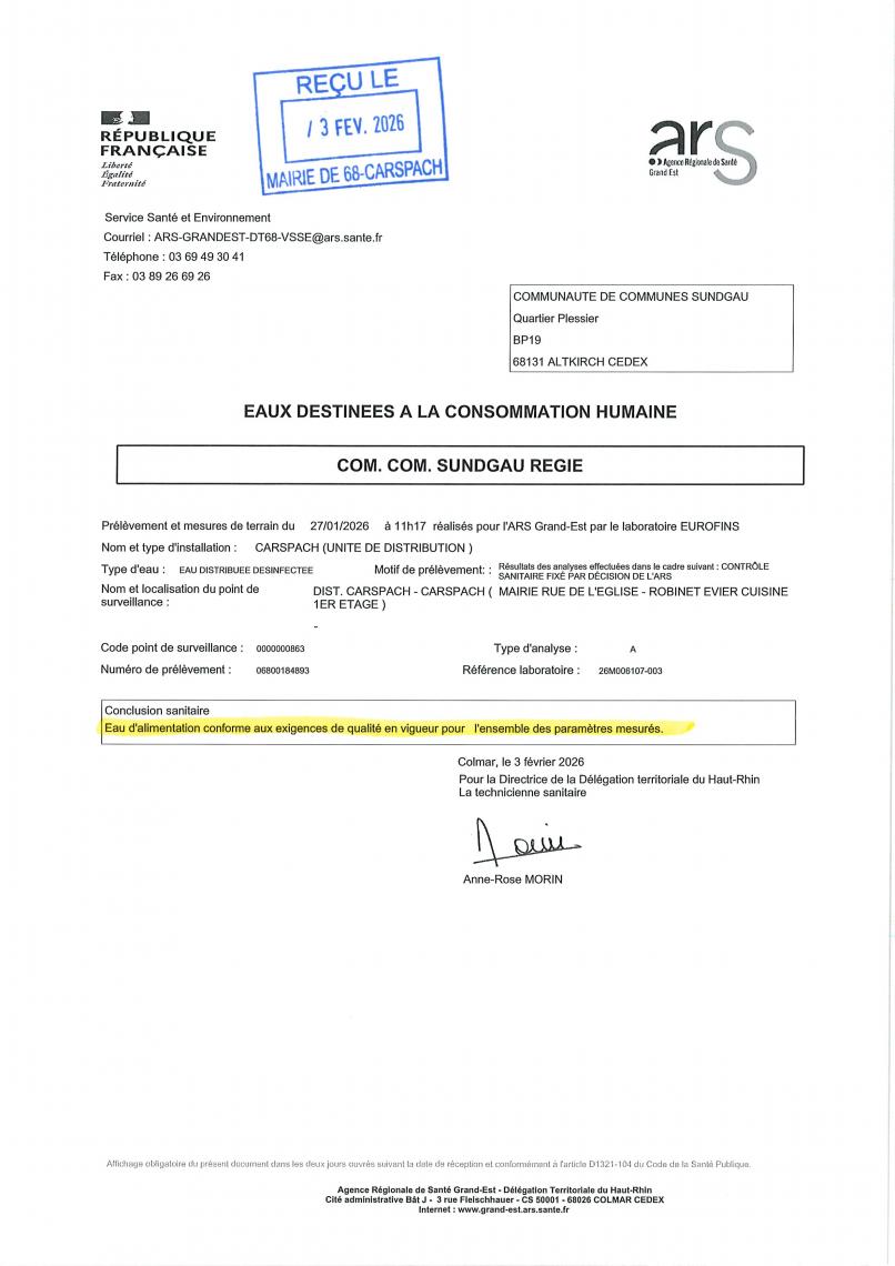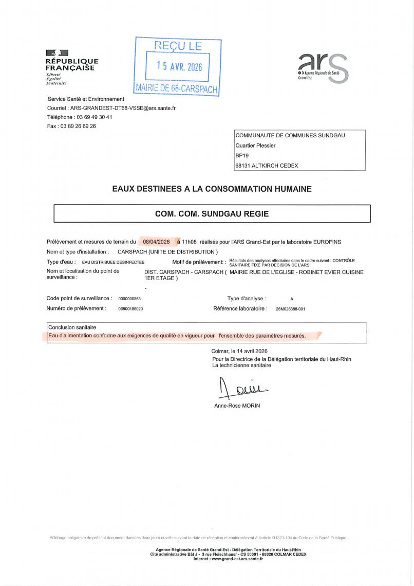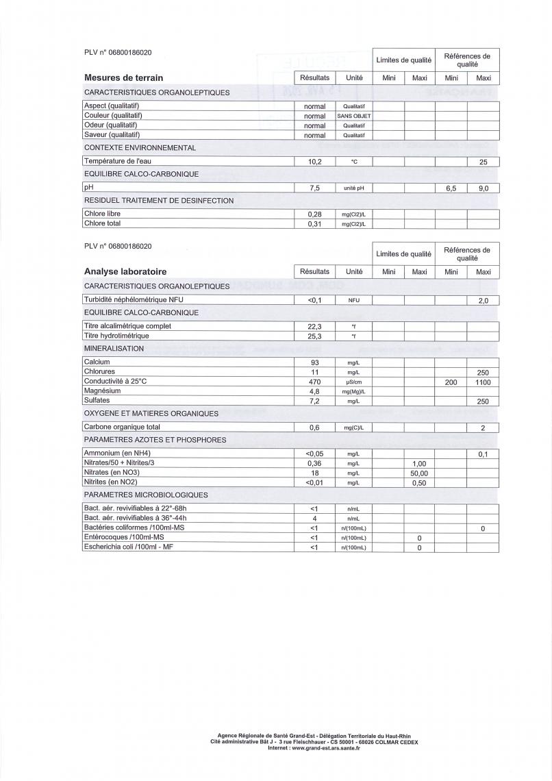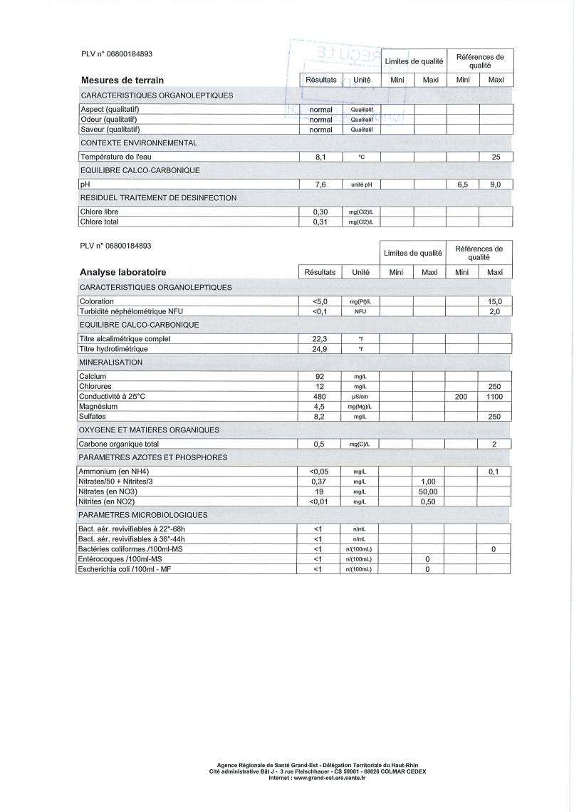Les résultats des analyses effectuées sur les prélèvements de l'eau sont également disponible sur le site de l'ARS :