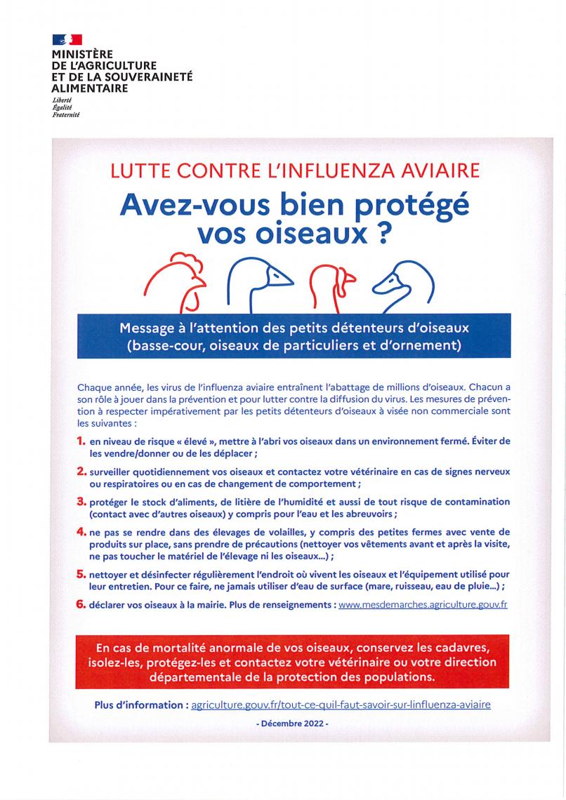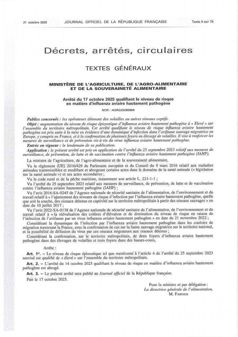 L'apparition de foyers d’influenza aviaire hautement pathogène (IAHP) dans plusieurs élevages conjuguée à la mise en évidence du virus dans la faune sauvage a conduit le ministère de l’Agriculture et de la Souveraineté Alimentaire à relever sur l’ensemble du territoire métropolitain par arrêté du 17 octobre 2025 (ci-joint) le niveau de risque à « élevé» à compter du 22 octobre 2025.